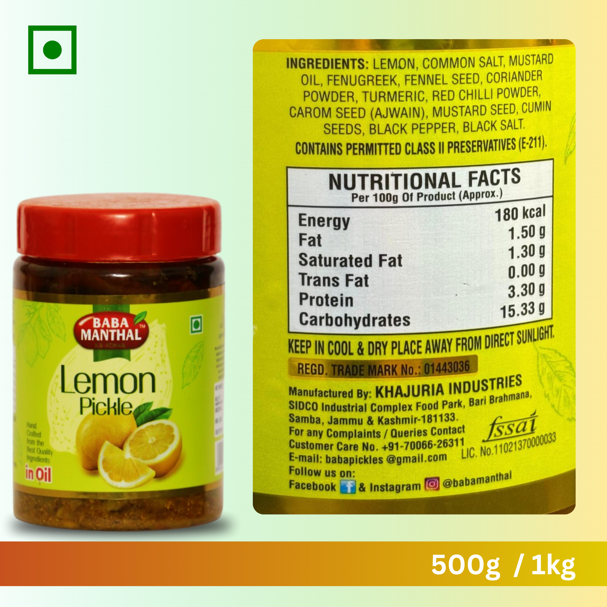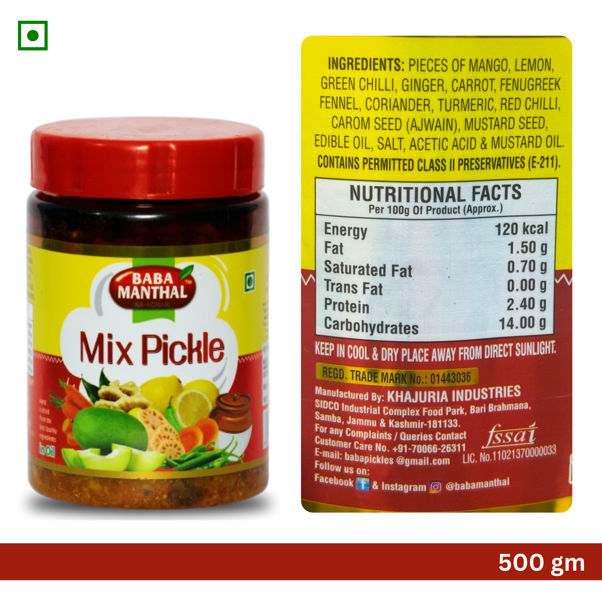 "Indulge in the rich and authentic flavors of India with our Baba Manthal Special Combo Pack of 3 Pickles. This exquisite trio features the tangy and subtly sweet notes of our traditional Mango Pickle, the zesty and refreshing burst of our homemade Lemon Pickle, and the delightful blend of diverse vegetables and spices in our Mixed Pickle. Crafted with care using time-honored recipes, each jar captures the essence of Indian culinary heritage, promising a delicious and flavorful journey for your taste buds."