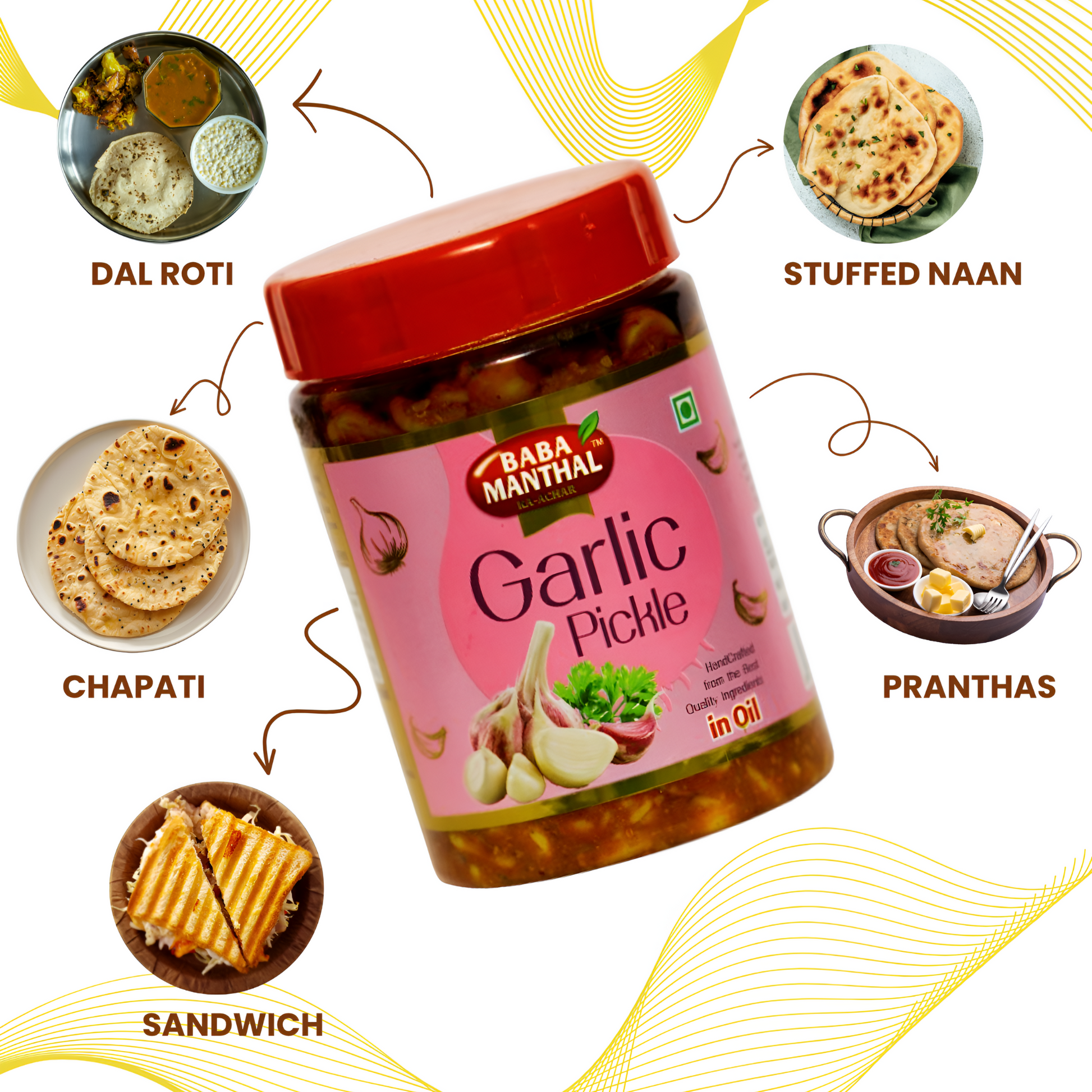 Baba Manthal's Garlic Pickle (Adrak ka achar) is a traditional homemade delicacy made with sun-dried garlic cloves, natural spices, and mustard oil. Crafted from a four-generation-old recipe, it's a preservative-free pickle that offers the authentic, comforting taste of homemade food.